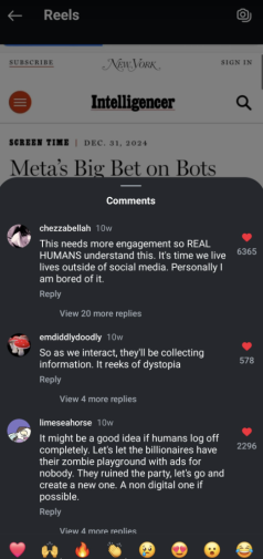 The only reason I’m on social media is to connect with people, not machines. If I wanted to connect with AI, I would just go to an AI chatbot. For now, I’m lucky that my feed is full of real people and it’s easy to tell what account is a bot, but who knows how long that will last.
